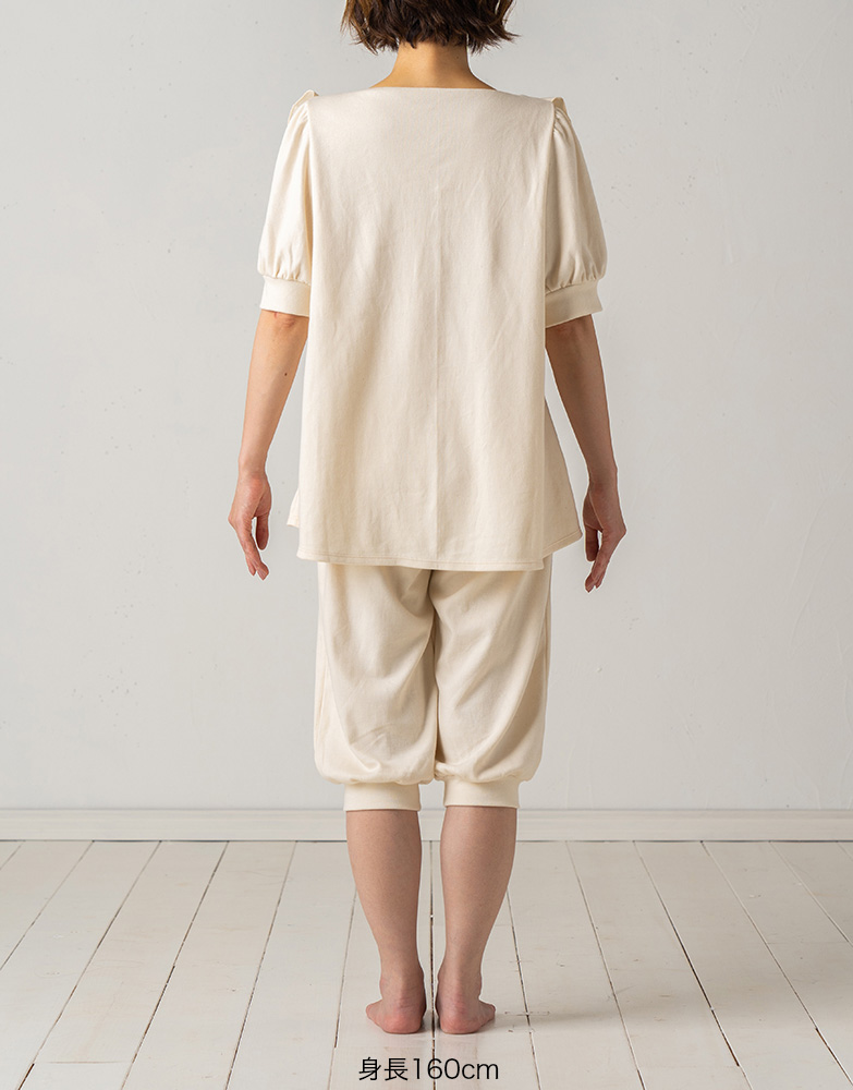 - ・トップスの表地よりも裏地の裾が少し長めになっており、涼しい季節や冷房をかけた室内でもお腹が冷えにくいように、ハーフパンツの中に裏地をインしやすい仕様になっております。
