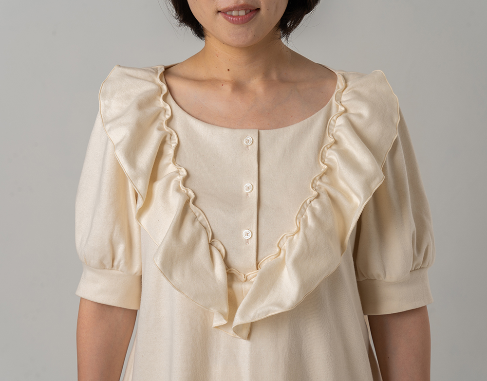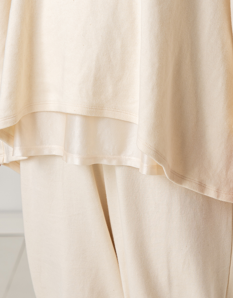 - ・襟ぐりは、化粧水をデコルテ部分まで付けやすく、かつ前屈みになっても胸が見えにくい仕様になっております。